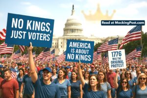 Protesters rally under the banner “No Kings,” prompting GOP outrage and a reminder that 1776 was basically the same event…